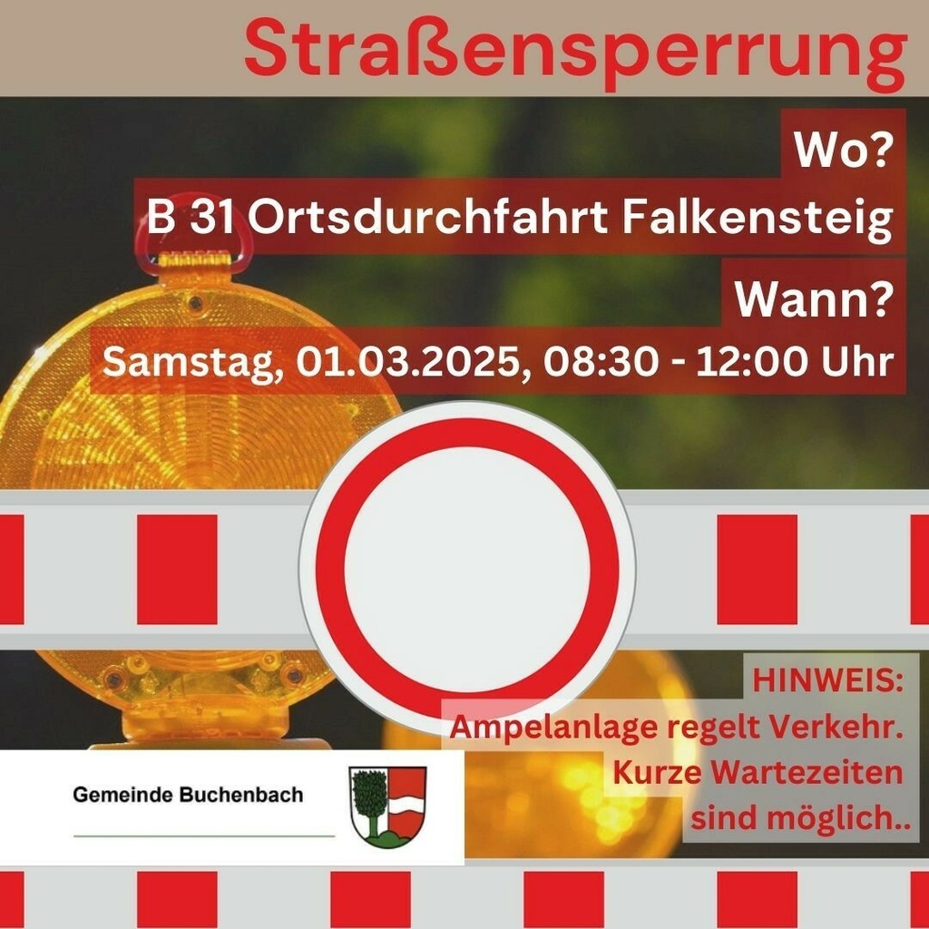 Verkehrsbehinderung B 31 in Buchenbach-FalkensteigHalbseitige Sperrung und kurzzeitige Vollsperrung der B 31 am Samstag, 01.03.2025 von 8.30 Uhr bis 12.00 Uhr.