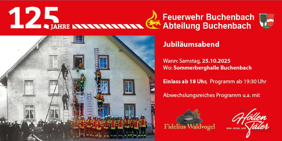 Die Feuerwehr Abteilung Buchenbach besteht seit 125 Jahren. Frauen und Männer setzen sich seit 125 Jahren für den Schutz der Bürger und Gäste der Gemeinde Buchenbach ein. Dieses besondere Jahr wurde mit einem Jubiläumsabend am Samstag, den 25.10.2025 in der Sommerberghalle gefeiert.
